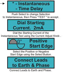 1)將測試儀開機,儀器自檢,出現(xiàn)右圖第一個(其中Instantaneous為跳斷電流選項)